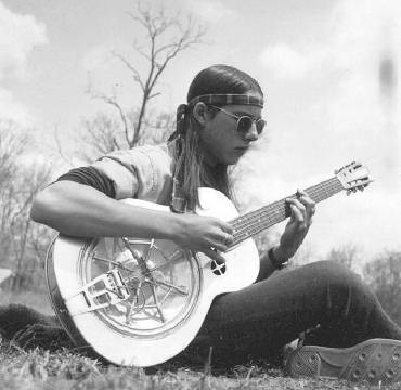 Peter Lewis, CLS'71, chords on a National steel-bodied resonator guitar