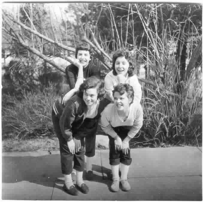 Barbara Gross (rear left), Dale Bederson (rear right), Judy Hess (front left), and June Nojima, all CLS'56, in 1955. [Photo credits: Stuart A. Varden, CLS'56]