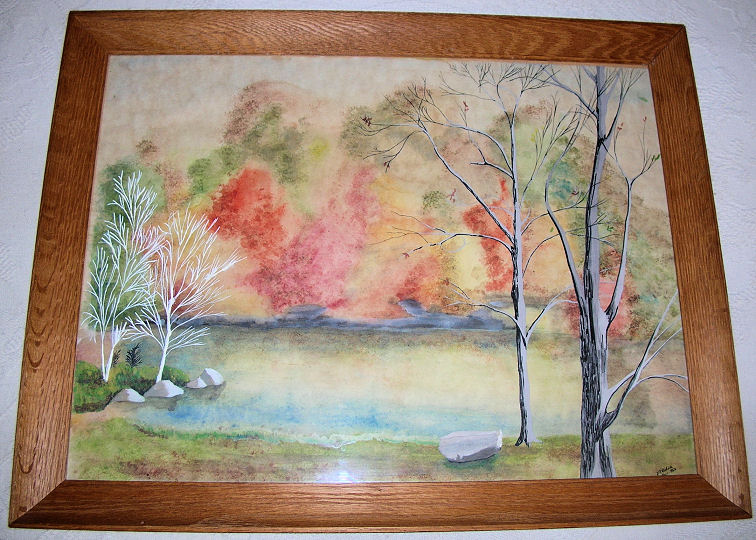 It was a view from the Art studio building looking across the Lake. It was done around Nov. 1964. Lucy Koch was the Art teacher then. My Mother, Yvonne Gibson, was a housemother at CLS between 1962-1967. She had this hanging on her wall as long as I can remember. When I took it down recently, while helping her move..... there was a form still glued to the back. I remembered that Lucy Koch had entered this into an all Connecticut statewide Art show at Yale in the spring of 1965. I remember going with her to the exhibit in New Haven. I believe it won some kind of prize although not sure if it was a ribbon or what. Also I remember somebody at the exhibit wanted to buy it but I had promised it to my mother who has had it ever since....it survived through many moves even back and forth across the Atlantic.