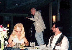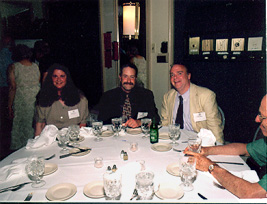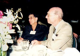 (Seated: Janet Wuchiski (friend), Peter Lewis-'71; Background: Herbert Goldfrank-'25 delivering remarks at banquet) |