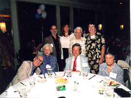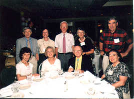 (Table 4: Seated: David Gorn-'54, Ted Lavoot-'54, Terri Lavoot (spouse), Louis Roberts-'54, & Richard Kovner-'54; Standing: Jerry Strauss-'54, Clover Vail-'57, David Schancupp-'57, David Drezner-'57) |